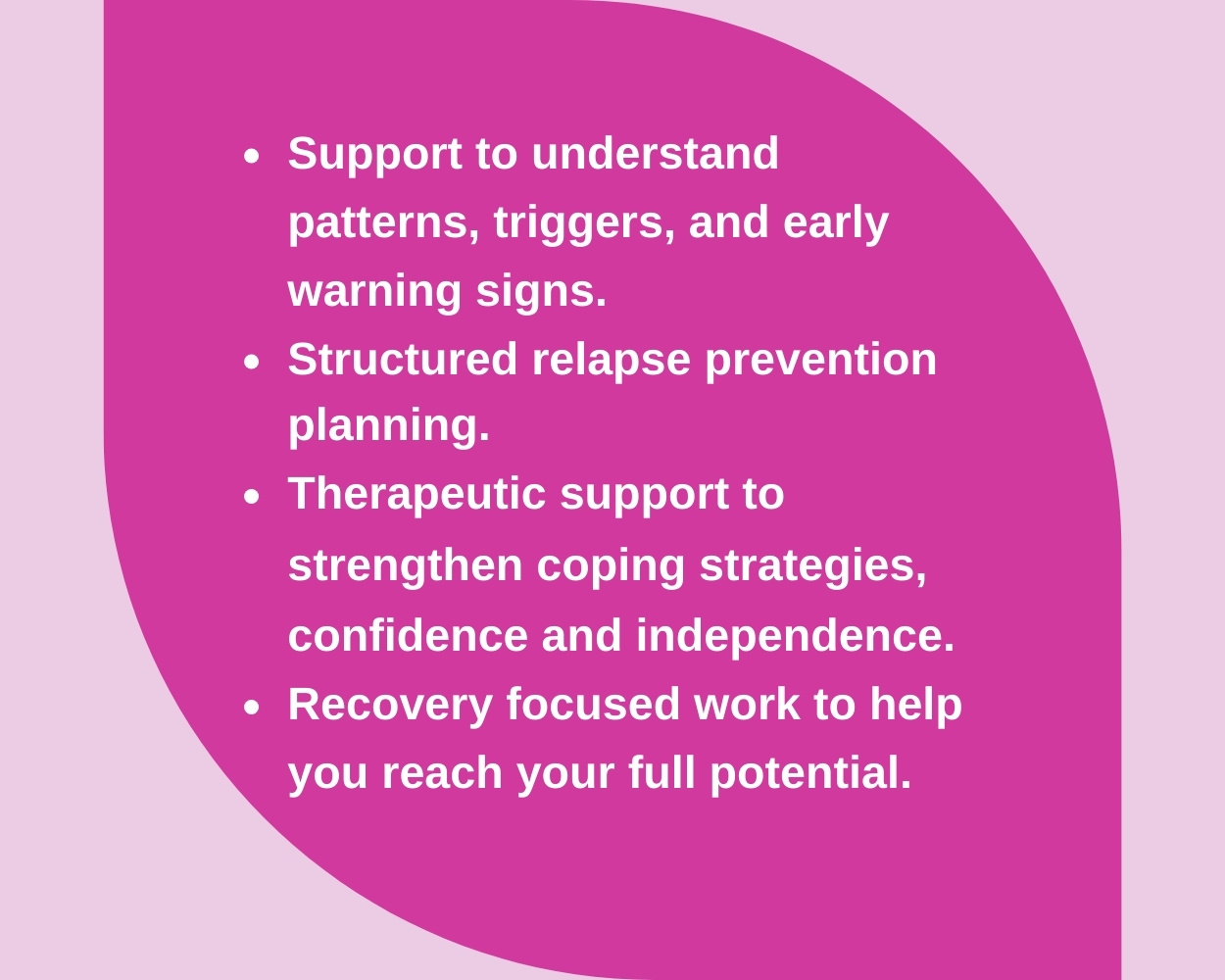 Many people reach a stage where they no longer qualify for secondary care, yet wish to better understand their mental health, build self-confidence, and develop effective coping strategies to prevent relapse. We recognise that recovery doesn’t end at discharge, and ongoing, focused support can make a meaningful difference in maintaining mental wellbeing and emotional resilience.